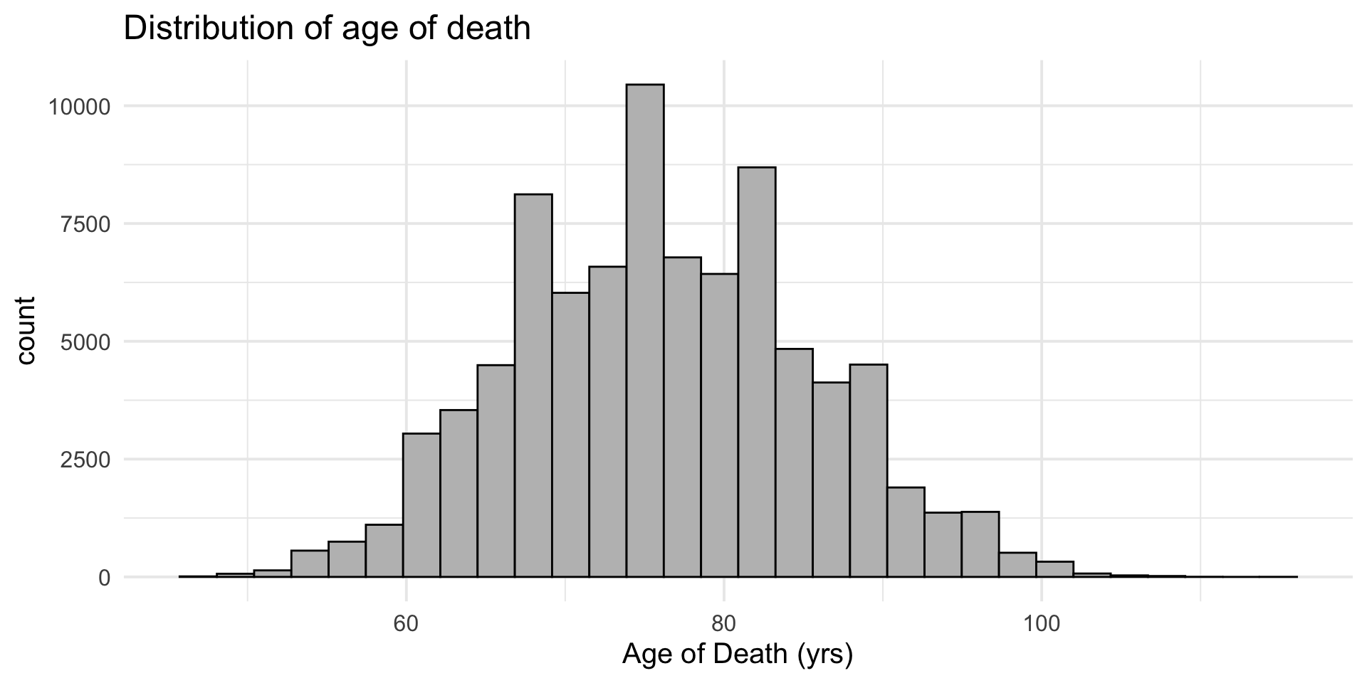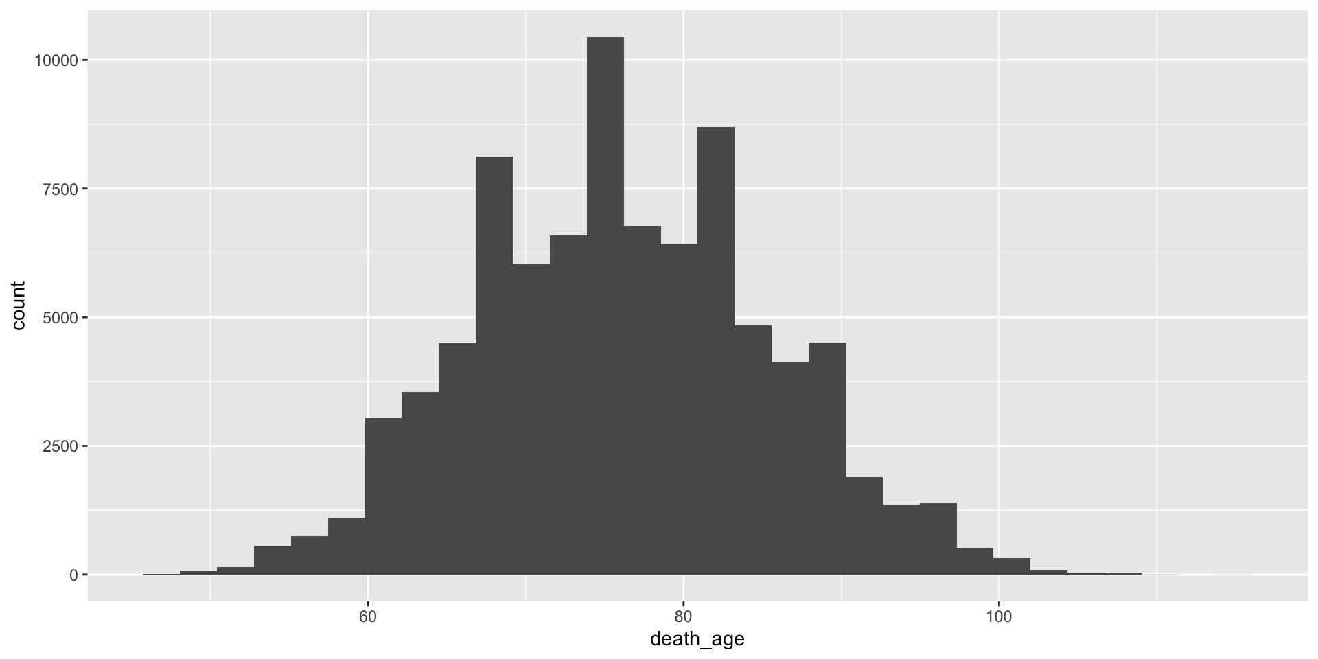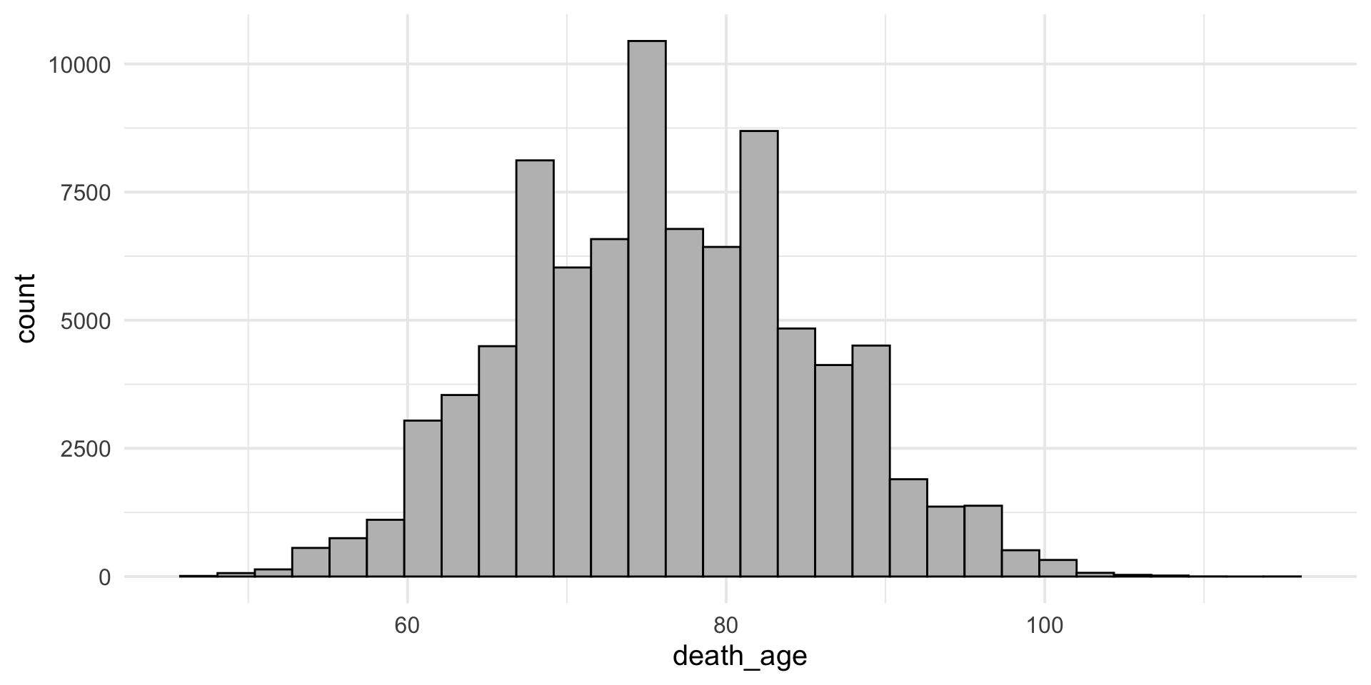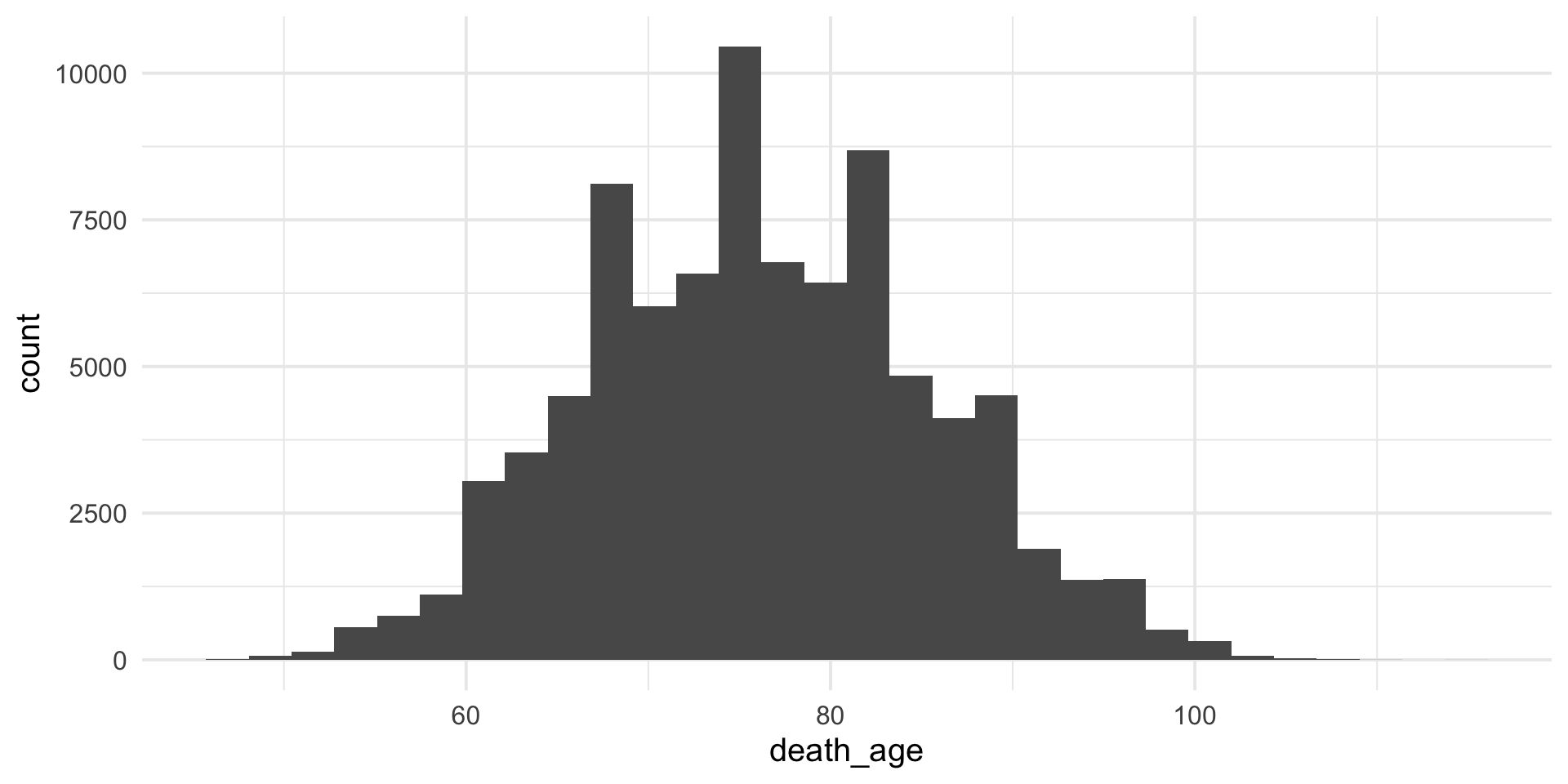 Make a histogram of the variable death_age. When are most people dying?