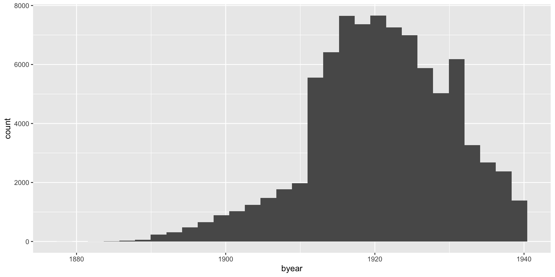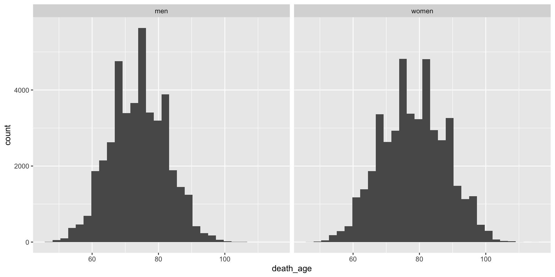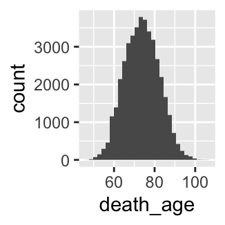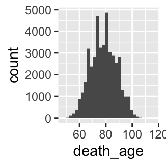 death_age. When are most people dying?byear. When are most people born?sex from numeric values (1, 2) to take character values (“men” and “women”). Note that 1 = men, 2 = women.# A tibble: 6 × 2