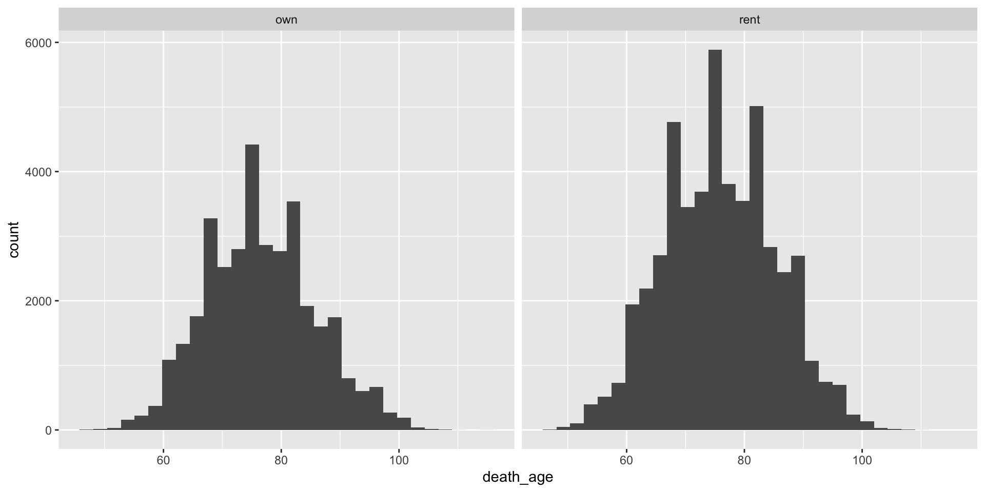 Make a histogram on the age of death for “homeowner” and “renter” groups using ggplot using the censoc_homeownership data.frame. Use the + facet_wrap(~homeowner) command.