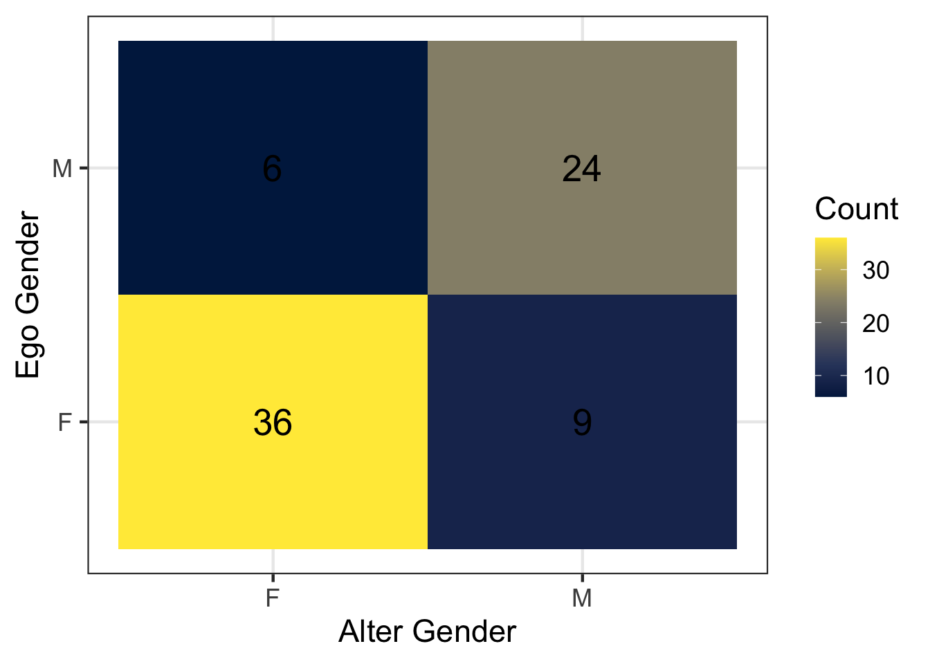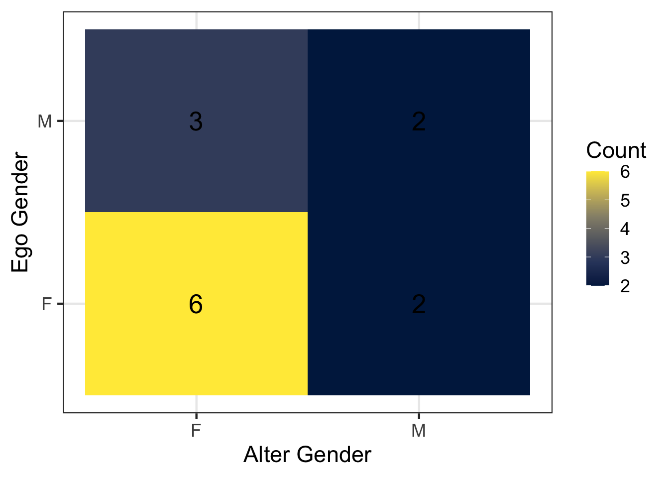 geom_tile(): the function geom_tile() draws a heatmap where each square (tile) represents a combination of ego gender and alter gender. The color of the tile corresponds to the number of discussion ties between those groups.