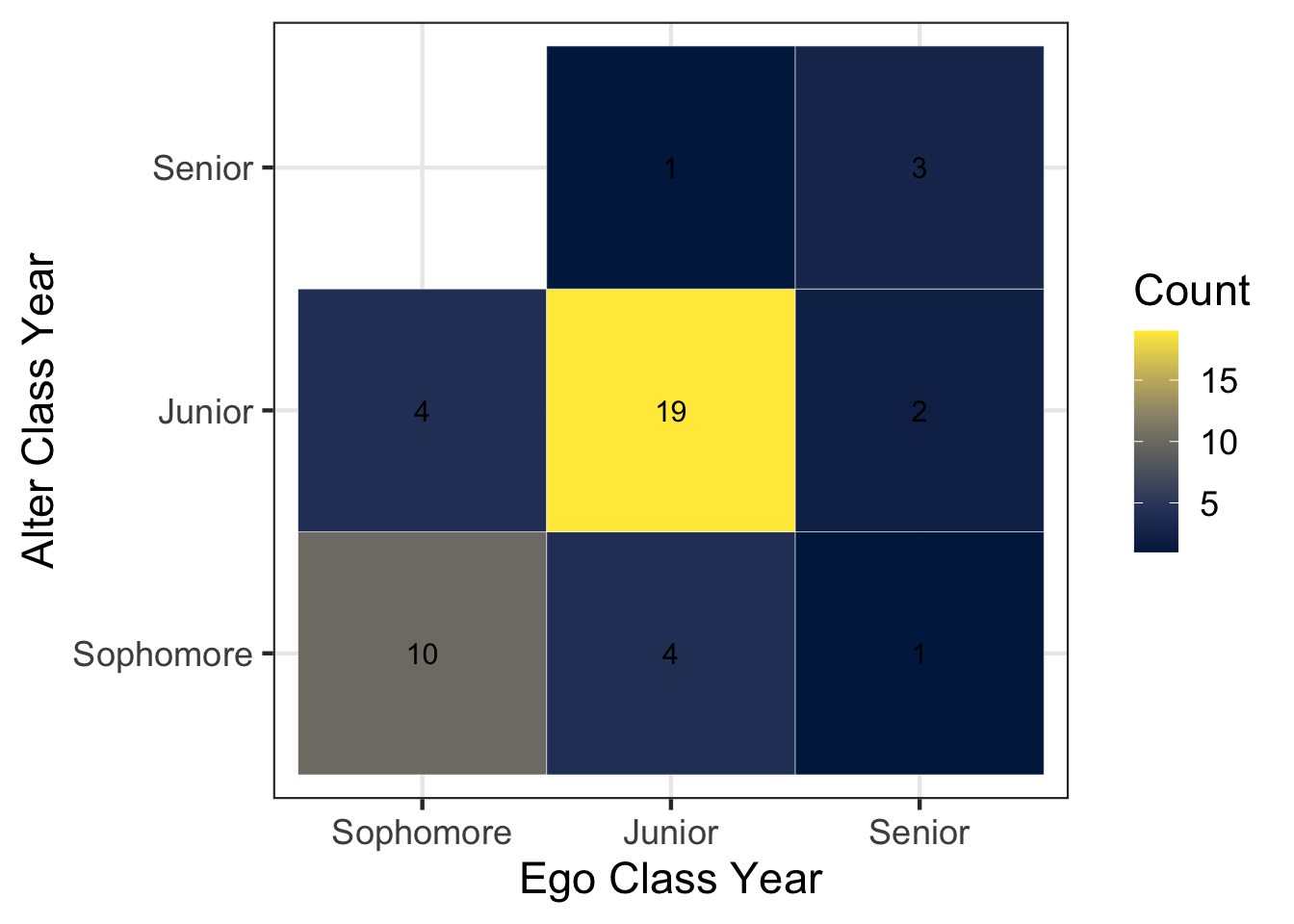 The code above is nearly identical to the previous chunk that examined gender. However, we add an additional step that converts the class year variables into ordered factor variables: factor(ego_classyear, levels = c("Freshman", "Sophomore", "Junior", "Senior")).