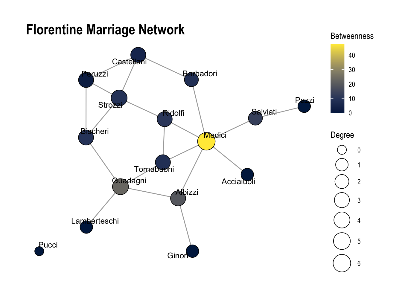 Now that we have a basic understanding of the network, we can do some basic analysis of the network. The Medici family was a powerful banking dynasty in Florence that produced renowned patrons of the arts, four popes, and two French queens, leaving a lasting impact on European economy, culture, and politics.
